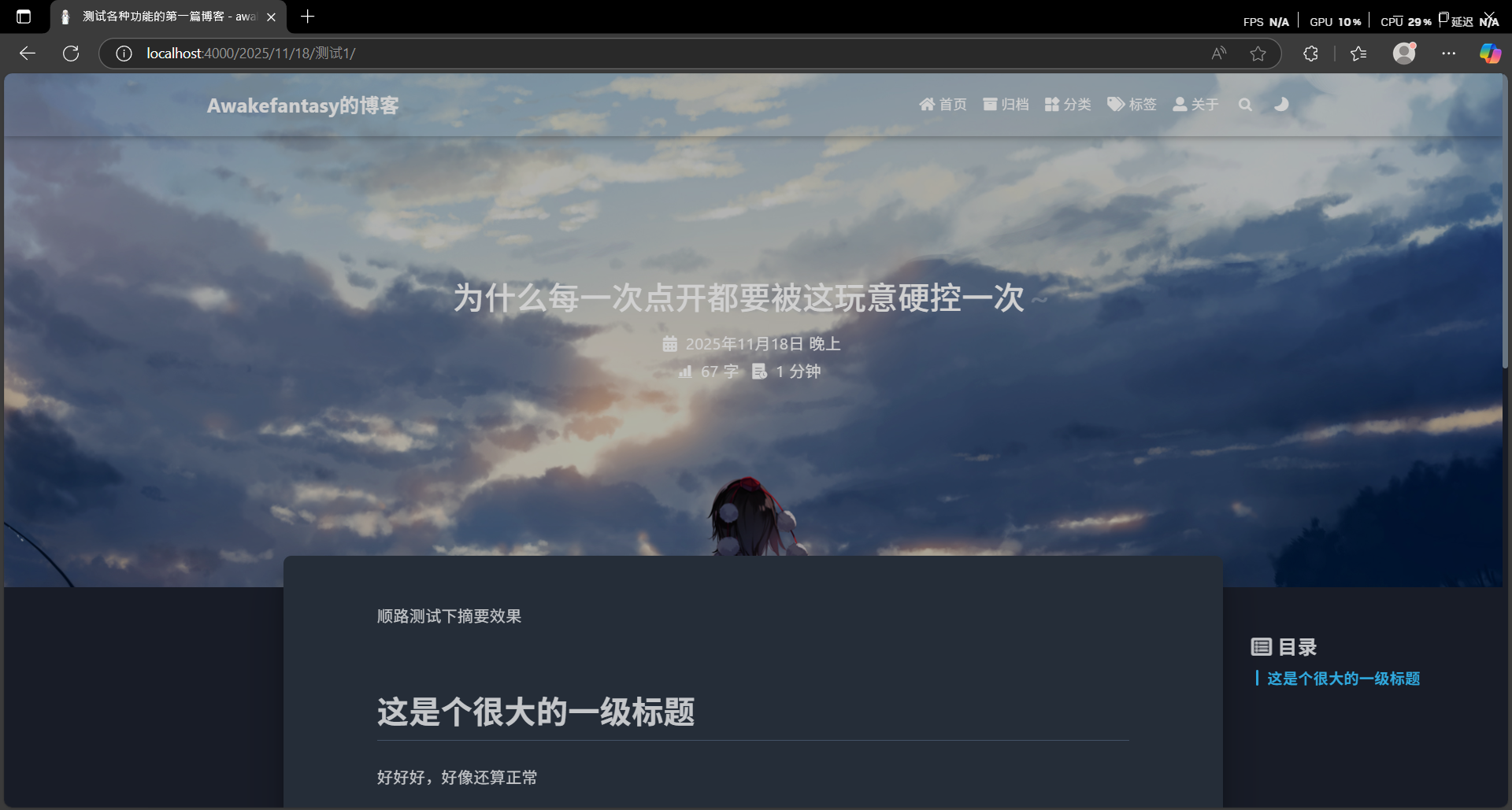 上文都写着问题一阶段了,那当然有问题二阶段😭,我将一阶段的问题整理后回复给了提出那个issue的朋友,没想到没过几天那位朋友就发现了新的问题:换成最新的文件之后所有的页面标题都变成了随机显示的文字了😭。效果如下,这篇博客是我用来测试博客功能的那篇博客,可以看到中间应该显示标题的地方显示的是“为什么每一次点开都要被这玩意硬控一次”。